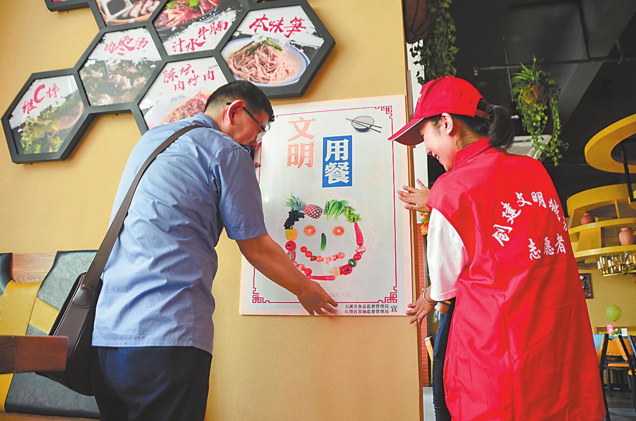 7月13日,红塔区市场监管局组织志愿者到辖区单位食堂、餐饮服务单位开展以“文明用餐 节俭养德”为主题的文明餐桌宣传活动。通过在就餐醒目位置悬挂或张贴文明用餐、社会主义核心价值观、创建文明城市等公益宣传标语、在餐桌安放相关内容的标牌等形式,广泛宣传文明餐桌礼仪和文明用语,培育餐饮文明新风,助力我市文明城市创建工作。